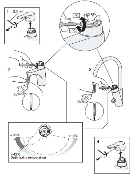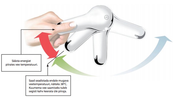 Temperatuuri AJUTISEKS SUURENDAMISEKS tuleb segisti kahv üle piiraja vasakule keerata. Kahva vabastamisel naaseb segisti tänu vedrule automaatselt optimaalse temperatuuri asendisse ja energiasääst jätkub justkui iseenesest.
